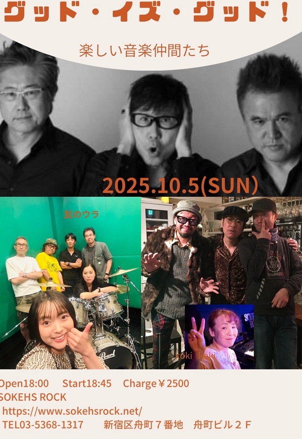 四谷三丁目 SOKEHS ROCK 【グッド・イズ・グッド!楽しい音楽仲間たち】 出演:koki koki / 髭のウラ / グッド・イズ・グッド! open 18:00 start 18:45 charge ¥2,500+order 四ッ谷ソケースロック + Add to Google Calendar + iCal / Outlook export Date 10月05日2025年 Expired! Time 6:00 PM Cost ¥2,500.00 Location 四谷三丁目 SOKEHS ROCK 東京都新宿区舟町7番地舟町ビル2F Website https://www.sokehsrock.net/ Category ライブ Share this event