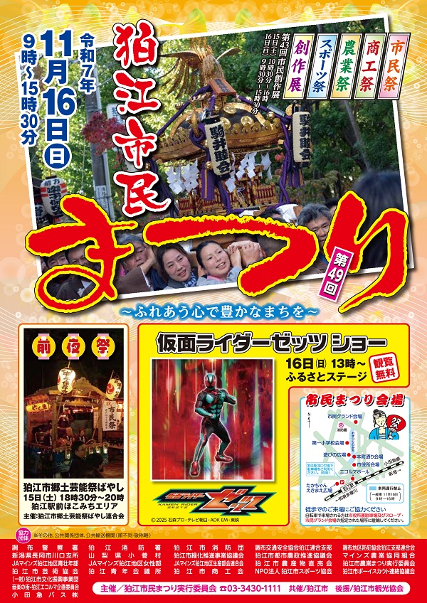 狛江市民祭り 狛江市民祭り 本町通りストリートライブ *出演者多数 10:55~15:05 入場無料 *GGの出演は13:15~13:45の30分予定です 詳しい情報は狛江市役所のHPでご確認下さい。 *狛江市役所 + Add to Google Calendar + iCal / Outlook export Date 11月16日2025年 Category イベント Share this event